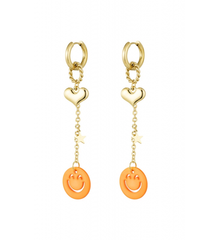 Goudkleurige oorhangers met hartje en een oranje smiley