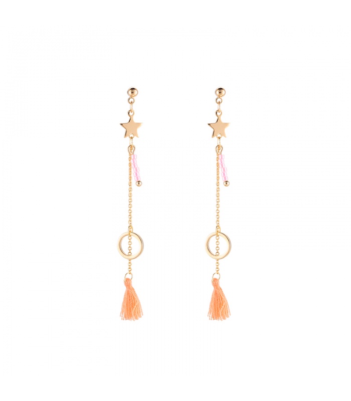 Goudkleurige oorhangers met ster en roze kwast aan een dun kettinkje.