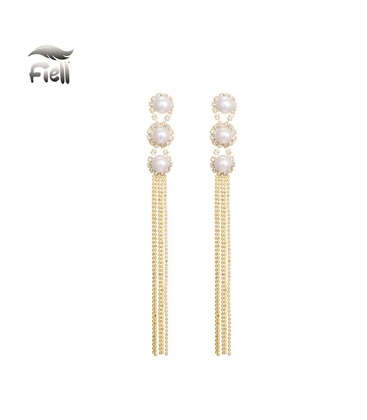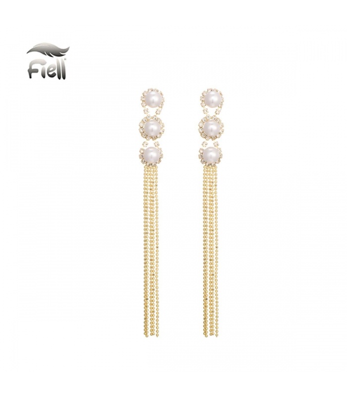 Goudkleurige oorhangers met strengen en witte kunst parels