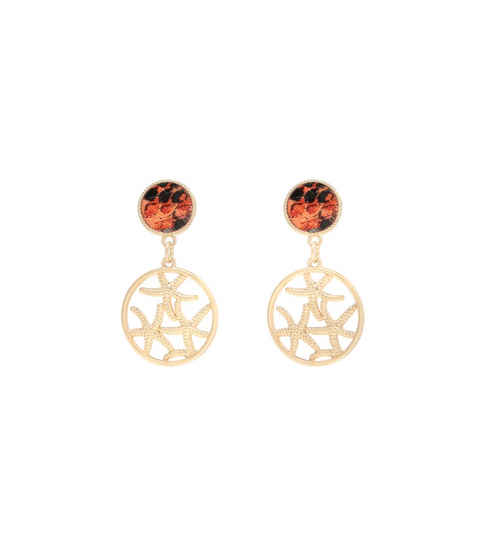 Goudkleurige oorhangers met zee sterren en een oranje gekleurd oorstukje