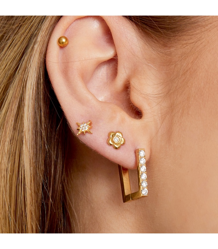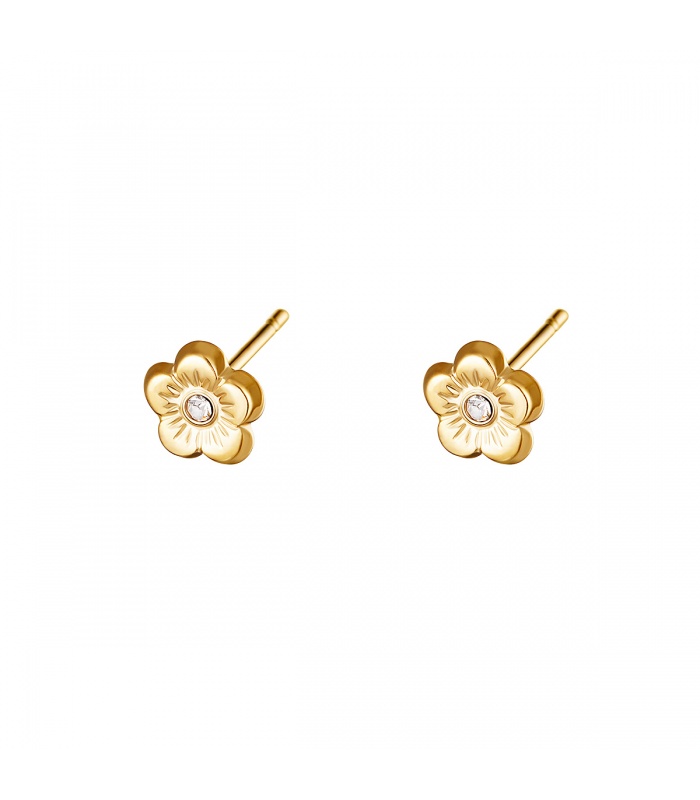 Leuke goudkleurige oorknopjes in de vorm van een bloem. In het midden van het bloemetje zit een klein steentje.