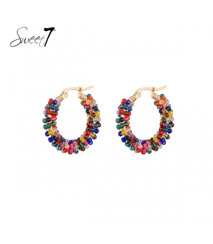 Goudkleurige oorringen met gekleurde kleine glaskraaltjes.