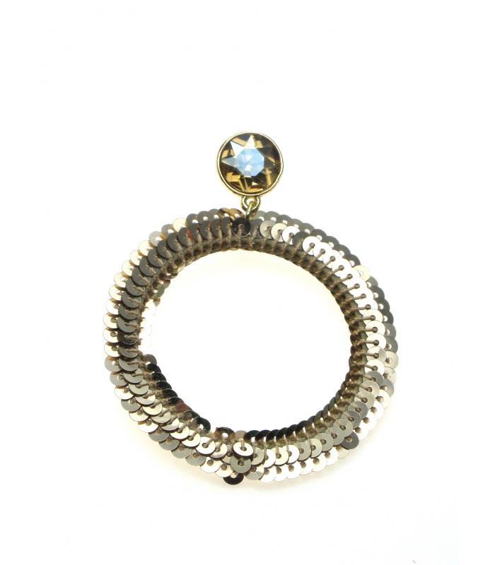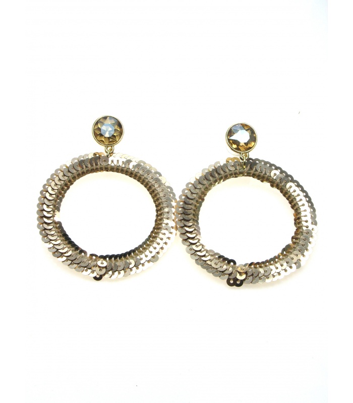 Goudkleurige ronde oorhanger gemaakt van goudkleurige pailletjes.