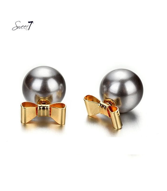Goudkleurige strik oorbellen met grijze bol voor een speelse en chique look.