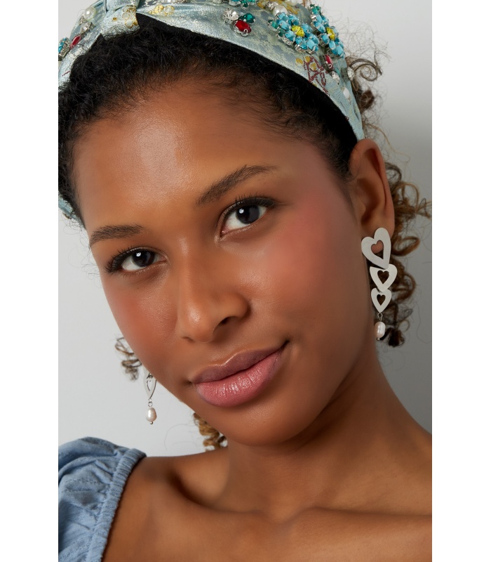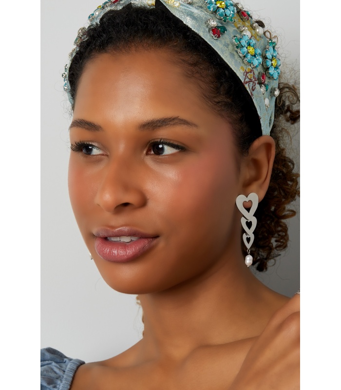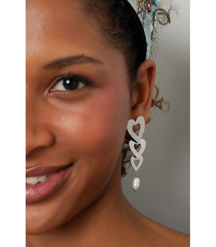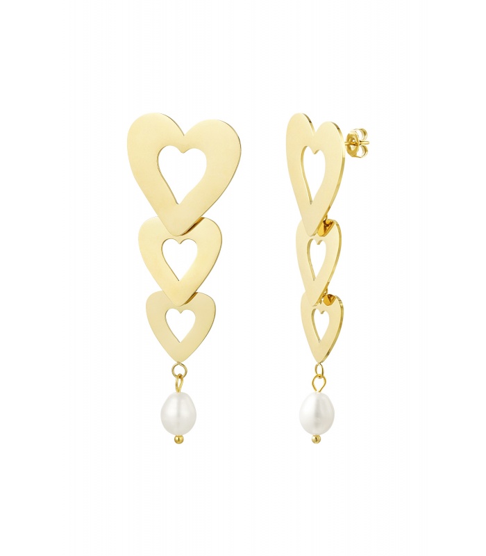 Wauw! Shop deze prachtige gouden oorbellen met drie hartjes en een toffe parel nu bij deoorbel.nl! De oorbellen zijn momenteel helemaal trendy en zijn de musthave voor aankomend seizoen! De oorbellen zijn erg leuk te combineren met meerdere hartjes sieraden en kun je bijvoorbeeld dragen tijdens een leuk festival. Ook leuk om deze oorbellen te combineren met een leuke haarband en jij bent klaar voor de zomer! De oorbellen zijn gemaakt van Stainless steel in combinatie met parels en hebben een afmeting van 6 x 2,1 cm.