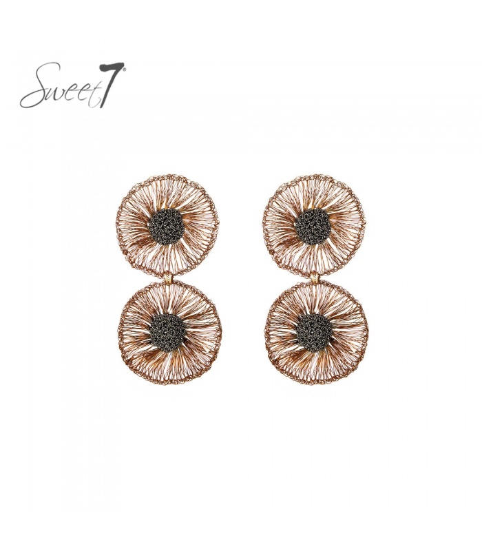 Hoe creëer je volume zonder zwaar aan te voelen? Deze oorbellen combineren twee ronde vormen met een luchtige, roségoudkleurige draadstructuur. De zwarte, glinsterende kern geeft het ontwerp extra diepte en een opvallend contrast.