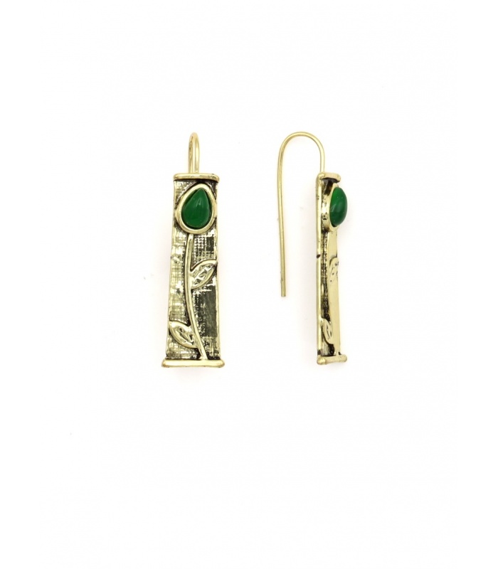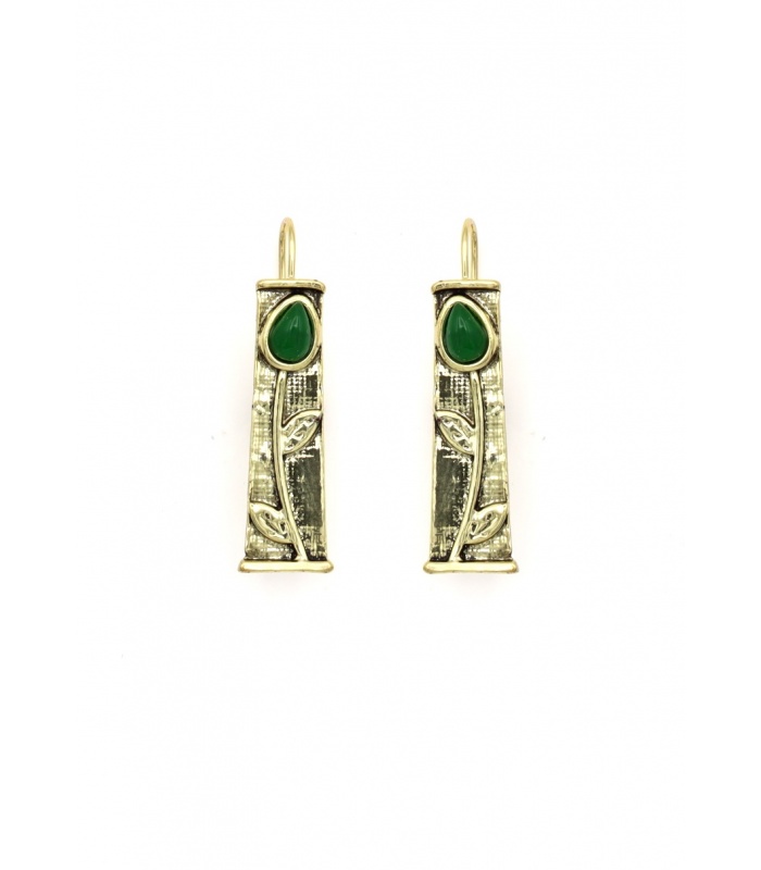 Hoe breng je natuurlijke elegantie subtiel in je look? Deze oorbellen combineren een strak rechthoekig design met een sierlijk bladmotief en een groene druppelvormige steen. De zachte glans van het metaal geeft het geheel een verfijnde uitstraling.