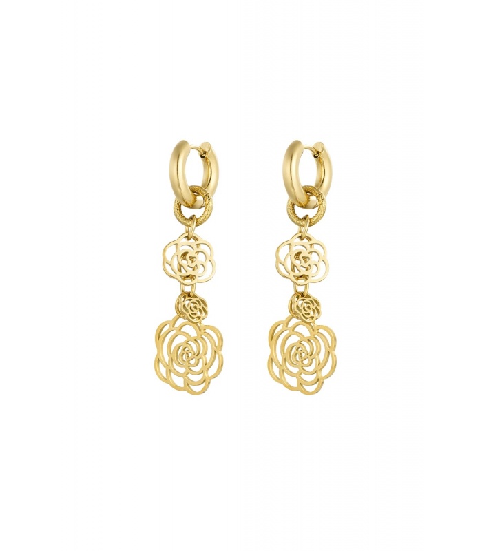 De strakke oorringen contrasteren prachtig met de gedetailleerde bloemvormige hangers. Deze combinatie maakt de oorbellen ideaal voor wie houdt van sieraden met karakter. Combineer ze met andere gouden sieraden voor een stijlvolle, tijdloze look.