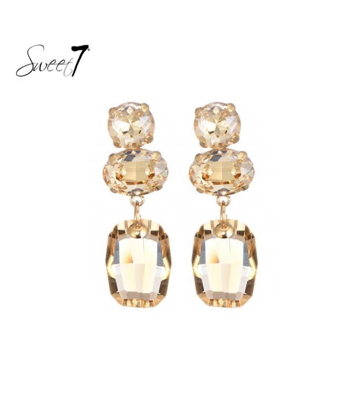 Hoe breng je subtiele glamour in je look? Deze oorbellen combineren drie champagnekleurige kristallen in oplopende vorm en glans. De facetgeslepen afwerking zorgt voor een elegante schittering bij elke beweging stijlvol en verfijnd.