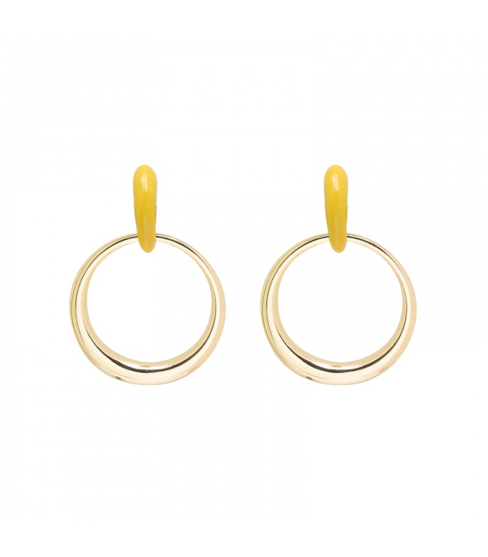Trendy goudkleurige oorbellen met een geel oorstukje.