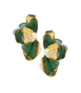 Goudkleurige oorhangers met groene stofdetails. Deze goudkleurige oorhangers met groene stofdetails zijn een opvallende mix van elegantie en speelsheid. De combinatie van de glanzende gouden afwerking met de zachte groene stof creëert een prachtig contrast dat direct in het oog springt.