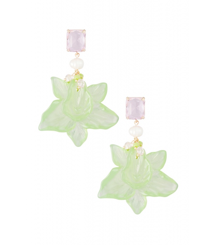 Groene bloemen oorhangers met een verfijnd roze oorstukje. Deze oorhangers zijn een must-have voor elke modebewuste vrouw. Hun unieke ontwerp, waarbij de zachtheid van roze bloemen gecombineerd wordt met een fris roze accent, maakt ze de perfecte accessoire voor elke outfit.