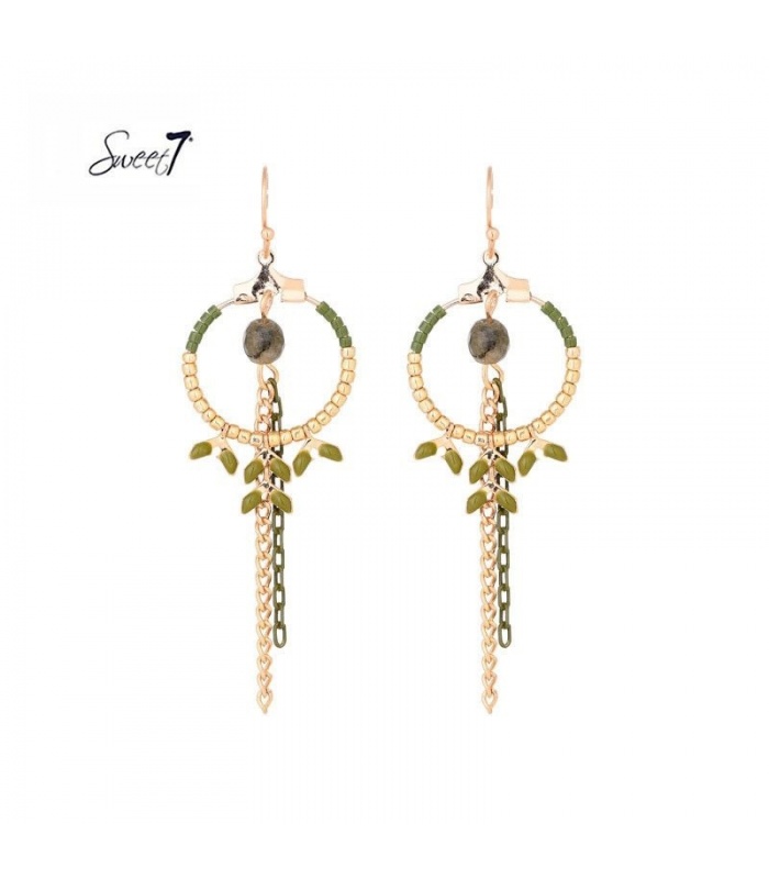 Groen oorhangers met goudkleurige kettinkjes en kraaltjes.