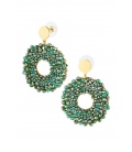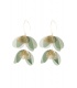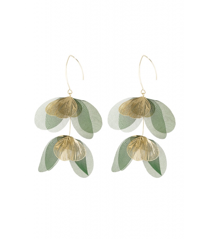 Deze oorbellen combineren groene stof met goudkleurige details, wat zorgt voor een unieke en modieuze uitstraling. De zachte textuur van de stof in combinatie met de glanzende gouden accenten maakt deze oorbellen tot een opvallend accessoire.