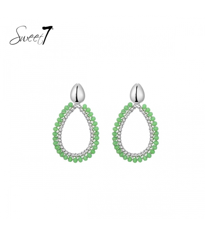 Zilverkleurige oorhangers met groene glas kraaltjes.