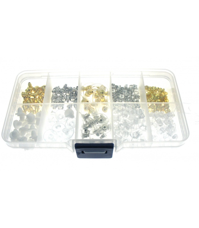 Handige box met een assortiment aan stoppertjes geschikt voor verschillende soorten oorbellen, stekers en oorhangers.