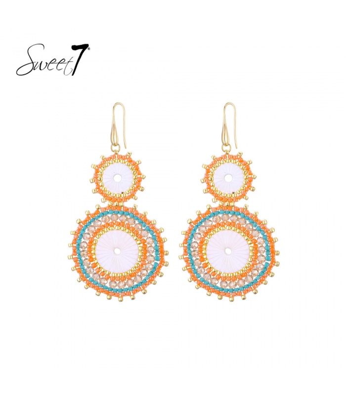 Wil je een oorbel die direct opvalt? Deze oorbellen met rond kralenpatroon in oranje, nude en goudkleur geven jouw look een trendy boost. De speelse combinatie van beads en cirkelvorm maakt deze statement oorbellen perfect voor een zomerse outfit of voor een feest.