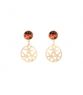 Goudkleurige oorhangers met rood en roze koord en gele strass steentjes. De lengte van deze oorbel is 3 cm. Voor oren met gaatjes. De oorbellen zijn nikkelvrij.