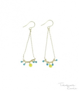 Trendy oorhangers met een gele cirkel en met een blauwe kraal en kunstparel. De lengte van deze oorbel is 6 cm. Voor oren met gaatjes. De oorbellen zijn nikkelvrij. De oorbellen zijn voorzien van stoppertjes.