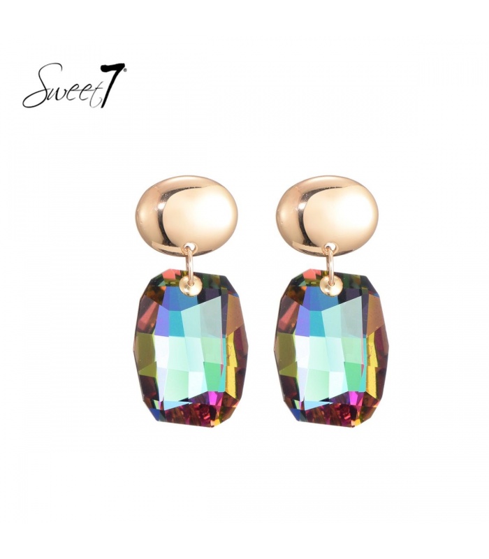 Hoe breng je leven in je look met een sieraad? Deze oorbellen vangen elke lichtstraal in een regenboog van kleuren. De facetgeslepen steen reflecteert groen, paars en goud perfect voor wie durft te stralen.