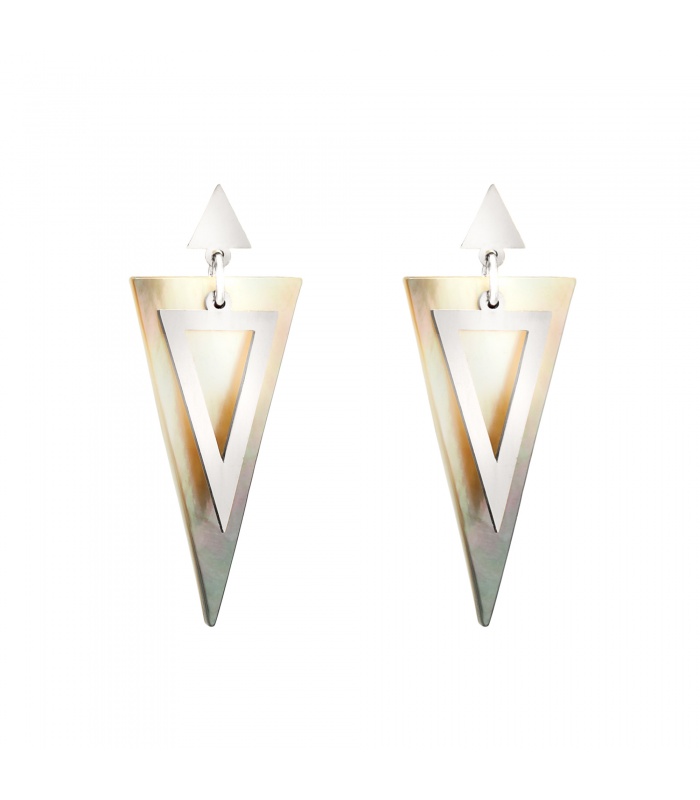 Zilverkleurige oorhangers met een parelmoer hanger en een zilverkleurig oorstukje.