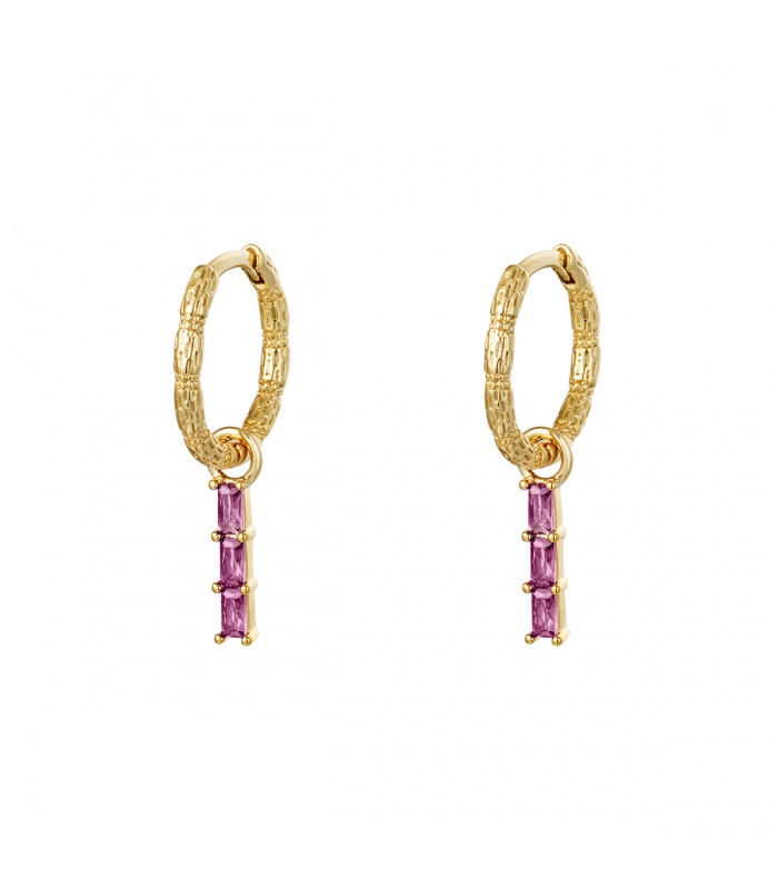 Goudkleurig bewerkte oorringen met een paarse hanger.