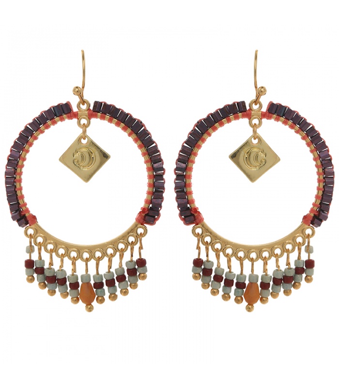 Oorbellen in ronde vorm met paarse kralen strengen.