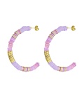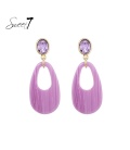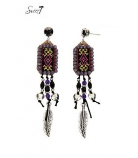 Paarse gekleurde oorhangers met stof en zilverkleurige bedels.