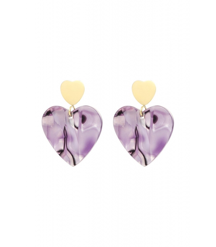 Paarse harten oorhangers en een goudkleurig harten oor stukje