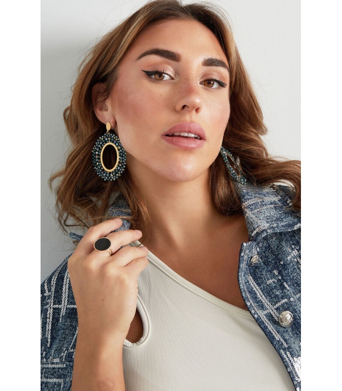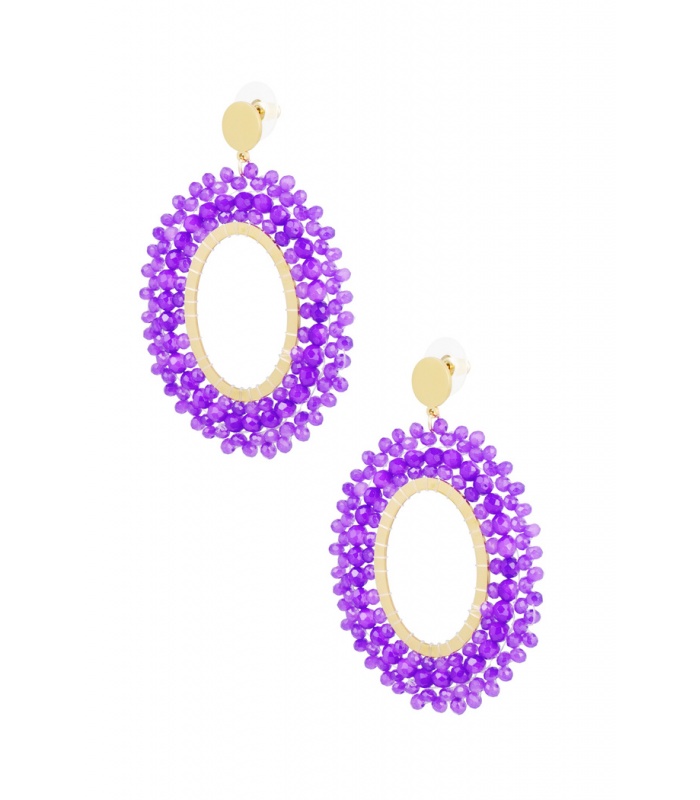 Paarse oorhangers met 3 rijen glas kralen en een goudkleurig oor stukje