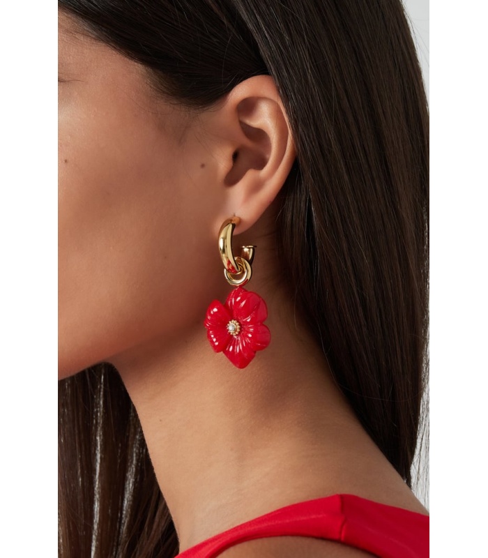 Deze goudkleurige oorbellen zijn voorzien van een opvallende rode bloemenhanger, wat zorgt voor een elegante en vrouwelijke uitstraling. Het contrasterende kleurenspel tussen het warme goud en het levendige rood maakt deze oorbellen een echte blikvanger.