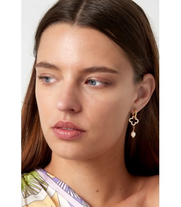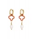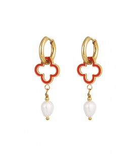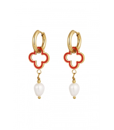Goudkleurige oorringen met een rode klaver en een witte parel: breng geluk en elegantie in je look!