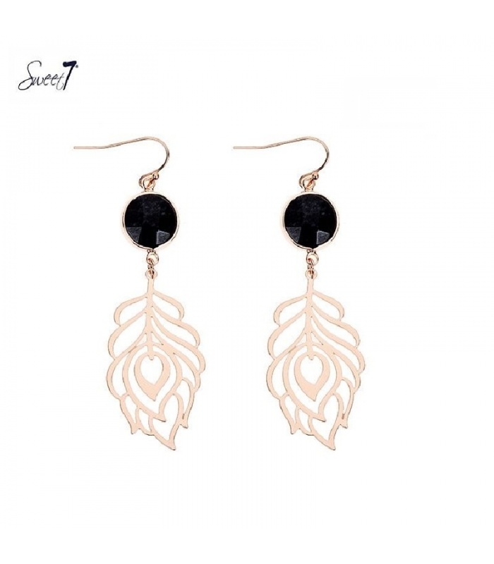 Goudkleurige oorbellen met bladvormige hanger en zwarte facet steen.