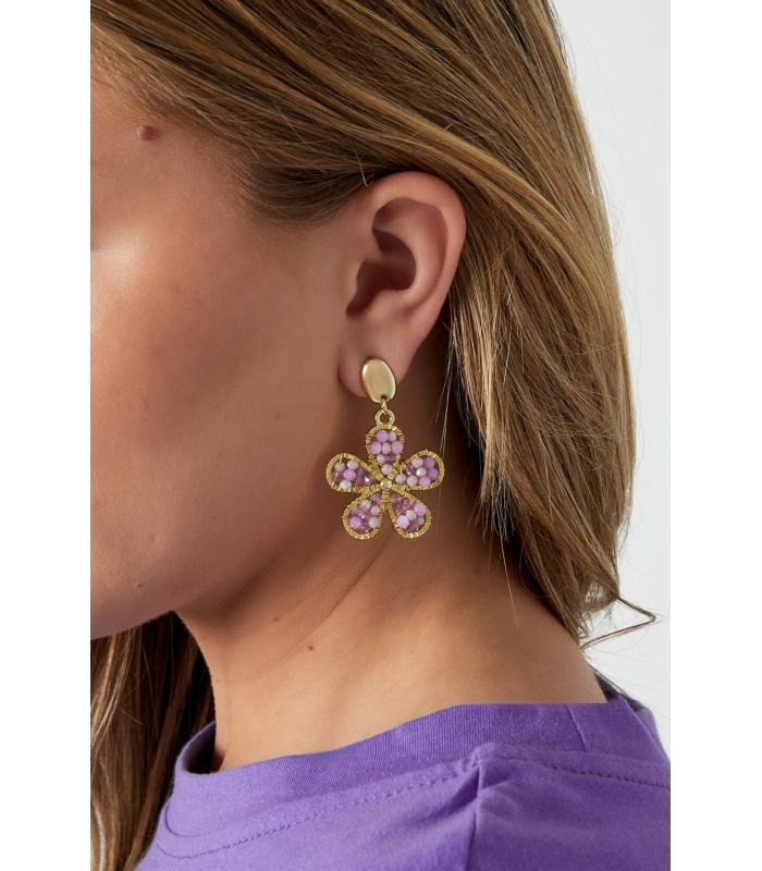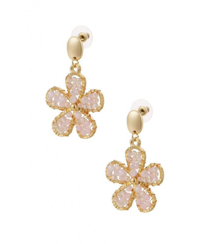 Goudkleurige oorbellen met bloemen bedel en roze steentjes