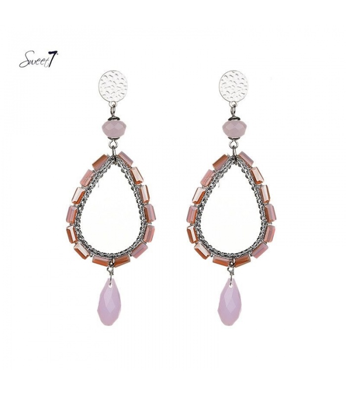 Langwerpige oorbellen met roze en taupe kralen in zilverkleurige zetting.