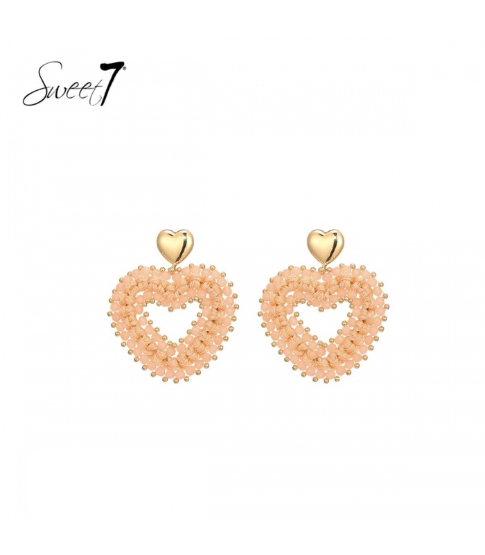 Pastel kleurige harten oorhangers met koord en glaskralen