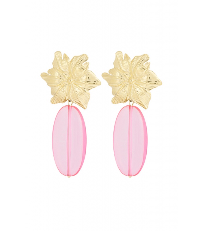 Voeg een vleugje elegantie toe aan je garderobe met onze exclusieve roze oorhangers, versierd met een goudkleurige bloem. Deze oorhangers zijn perfect voor elke modebewuste vrouw die haar outfit wil opfleuren. Geschikt voor zowel dagelijkse als feestelijke gelegenheden, zullen deze oorbellen zeker de aandacht trekken en je look completeren.