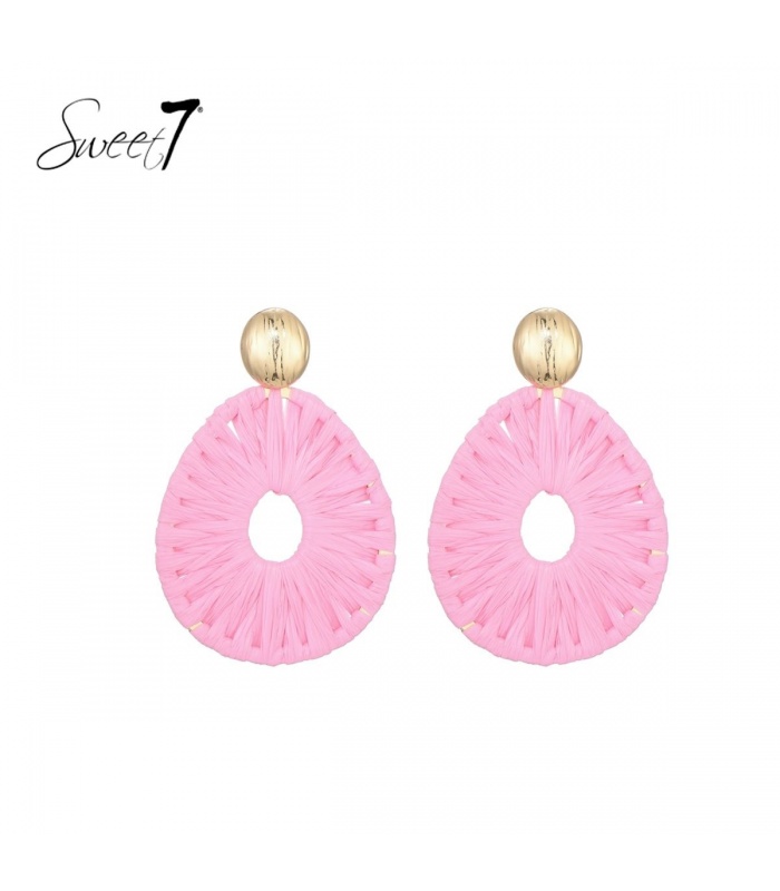 Roze oorhangers van Raffia met een goudkleurig oor stukje.