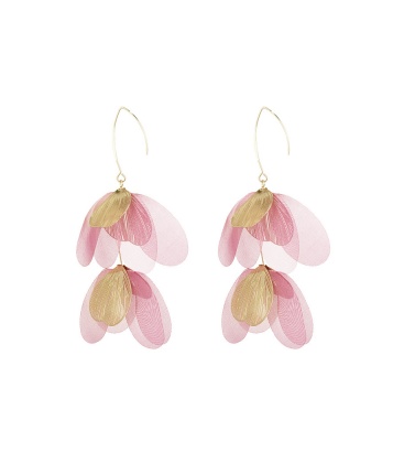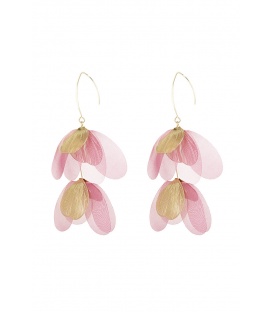 Deze oorbellen combineren zachte roze stof met stijlvolle goudkleurige details, wat zorgt voor een elegante en modieuze uitstraling. De combinatie van textiel en metaal geeft een unieke touch aan je look.