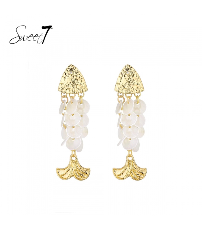 De speelse combinatie van witte schelpen schijfjes en een goudkleurige hanger geeft een verfijnd, maritiem gevoel. Deze oorbellen bewegen licht mee en zorgen voor een subtiel, sierlijk effect.