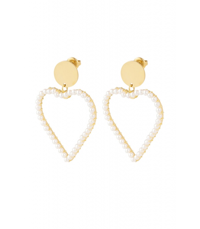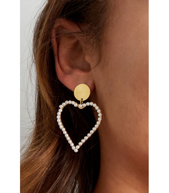 Goudkleurige oorhangers in de vorm van een hart met kunst pareltjes.