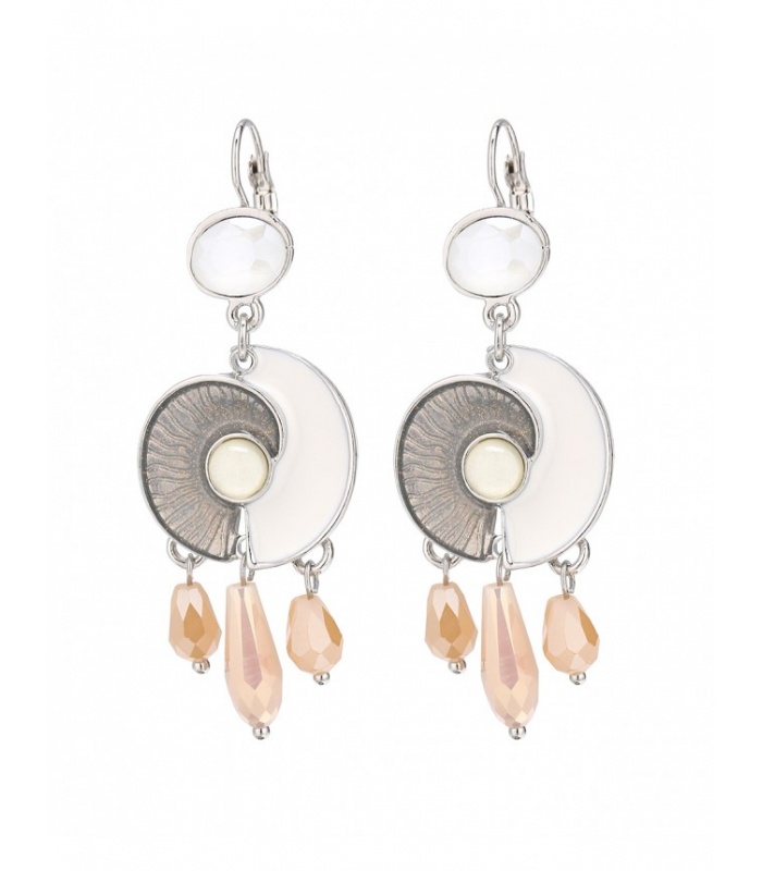 Oorbellen zilverkleur met wit, kralen en stras steentjes.