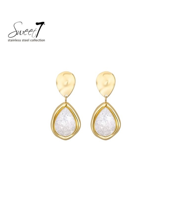 De oorbellen zijn gemaakt van sterk staal met een goudkleurige afwerking. De druppelvorm en lichte steen geven een rustige, chique look. Ideaal als stalen oorbellen of witte steen oorbellen die moeiteloos combineren.