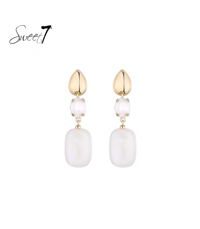 Deze oorbellen van Sweet7 combineren zachte witte stenen met een glanzend goudkleurige basis. De vorm is verfijnd, de uitstraling puur. Ze vangen het licht op elke beweging en zorgen voor een serene, stijlvolle look, of je nu op een event bent of gewoon jezelf wilt zijn met een vleugje klasse.