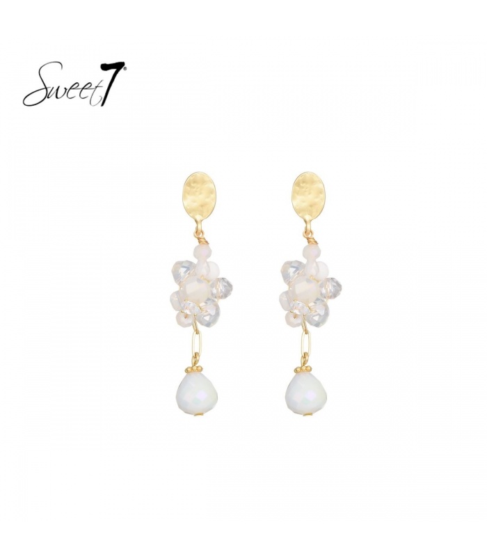 Deze witte glas kralen oorhangers stralen pure elegantie uit. De heldere, witte kralen combineren perfect met het goudkleurige oor stukje, wat een luxueuze en verfijnde look creëert. Ideaal voor zowel dagelijkse outfits als formele gelegenheden, deze oorbellen zijn een echte eyecatcher.