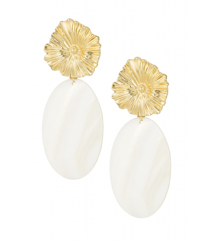 Witte schelpen oorhangers met een goudkleurige bloem als oor stukje