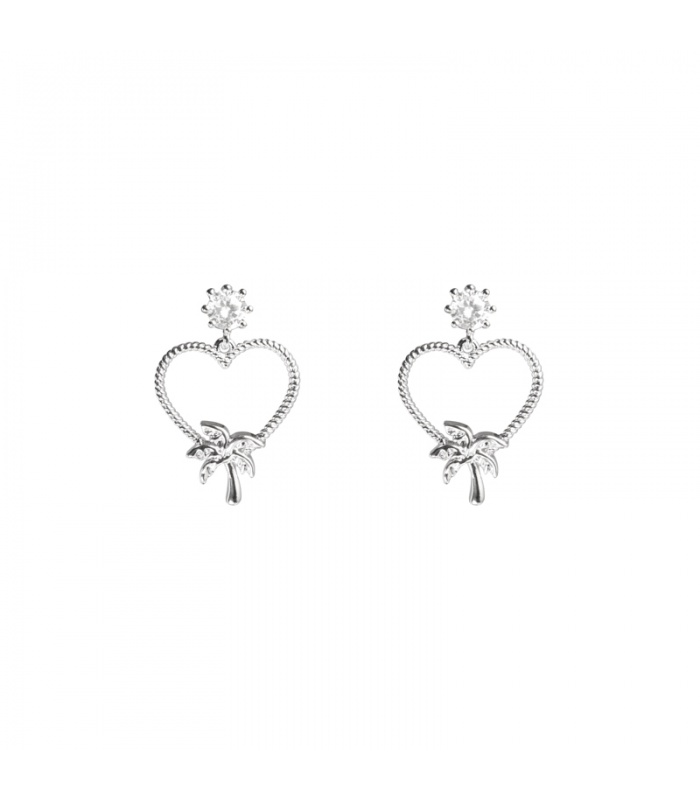 Fijne zilverkleurige oorbellen in hartvorm met een kleine ananas en palmboom