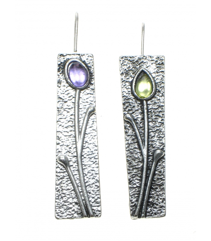 Langwerpige zilverkleurige oorhangers met paars en geel steentje.
