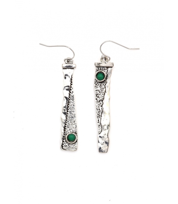 Oorbellen zilverkleurig met bewerkte textuur en een groen steentje