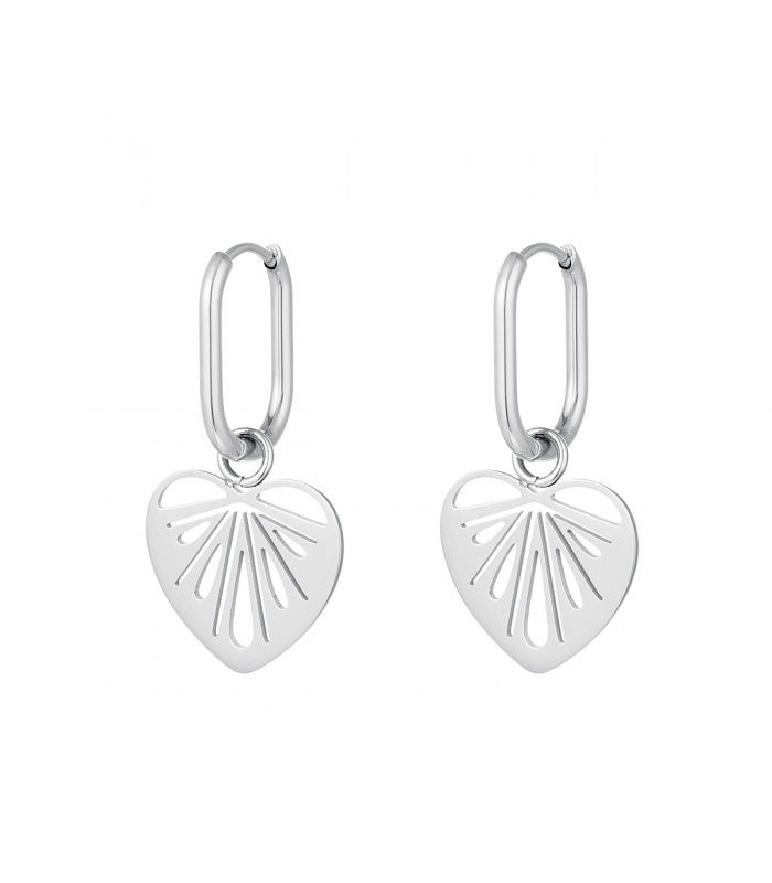 Zilverkleurige hartvormige oorbellen met uitgesneden details.